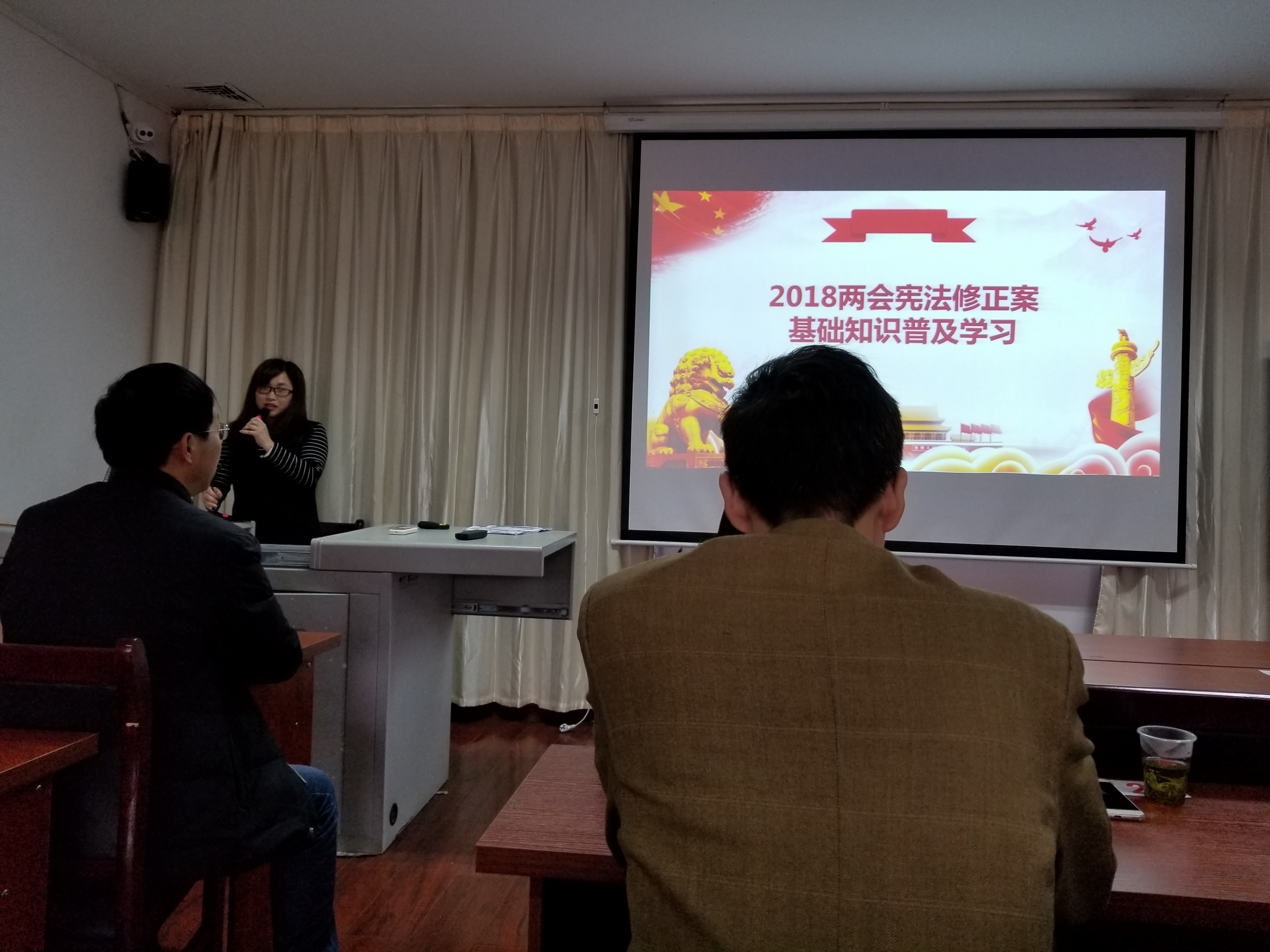 2018年3月30日上午,由支部书记李峰主持,郴州电大教工二支部开展了《宪法修正案》专题党课学习。青年党员陈秋蓉为在座党员精心解读了宪法及宪法修正的要点知识,深刻阐述了此次宪法修改的重大意义、主要内容和核心要义,并带领大家学习观看了深圳卫视《正午30分》关于宪法修正案的解读。