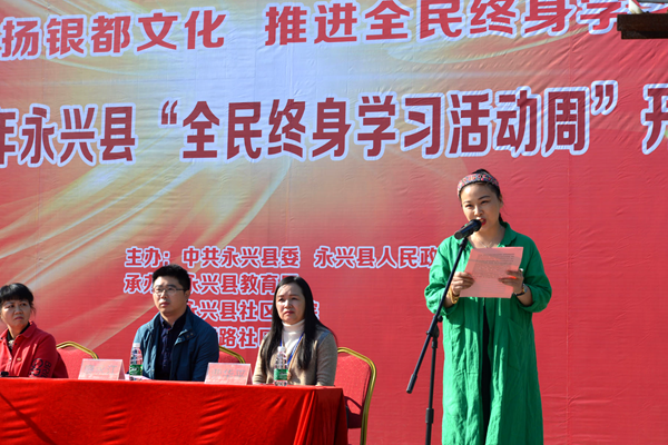 本次活动周主题为“弘扬银都文化,推进全民终身学习”。启动仪式在激越雄壮的九龙鼓声中拉开帷幕,县电大工作站站长(永兴社区学院院长)曹华平作全县终身教育工作报告。谭肖艳书记致辞祝贺,并高度评价了永兴县近年来终身教育所取得的成绩,就下一步如何推动终身教育工作提出了新的要求。周露副县长作总结讲话,她倡议:弘扬银都文化、推进全民终身学习,从我做起,从现在做起,让学习成为一种生活常态。县文明办主任陈莉芸宣读2018年度“百姓学习之星”表彰通报,全国“百姓学习之星”获得者何娟分享了自己的学习故事。